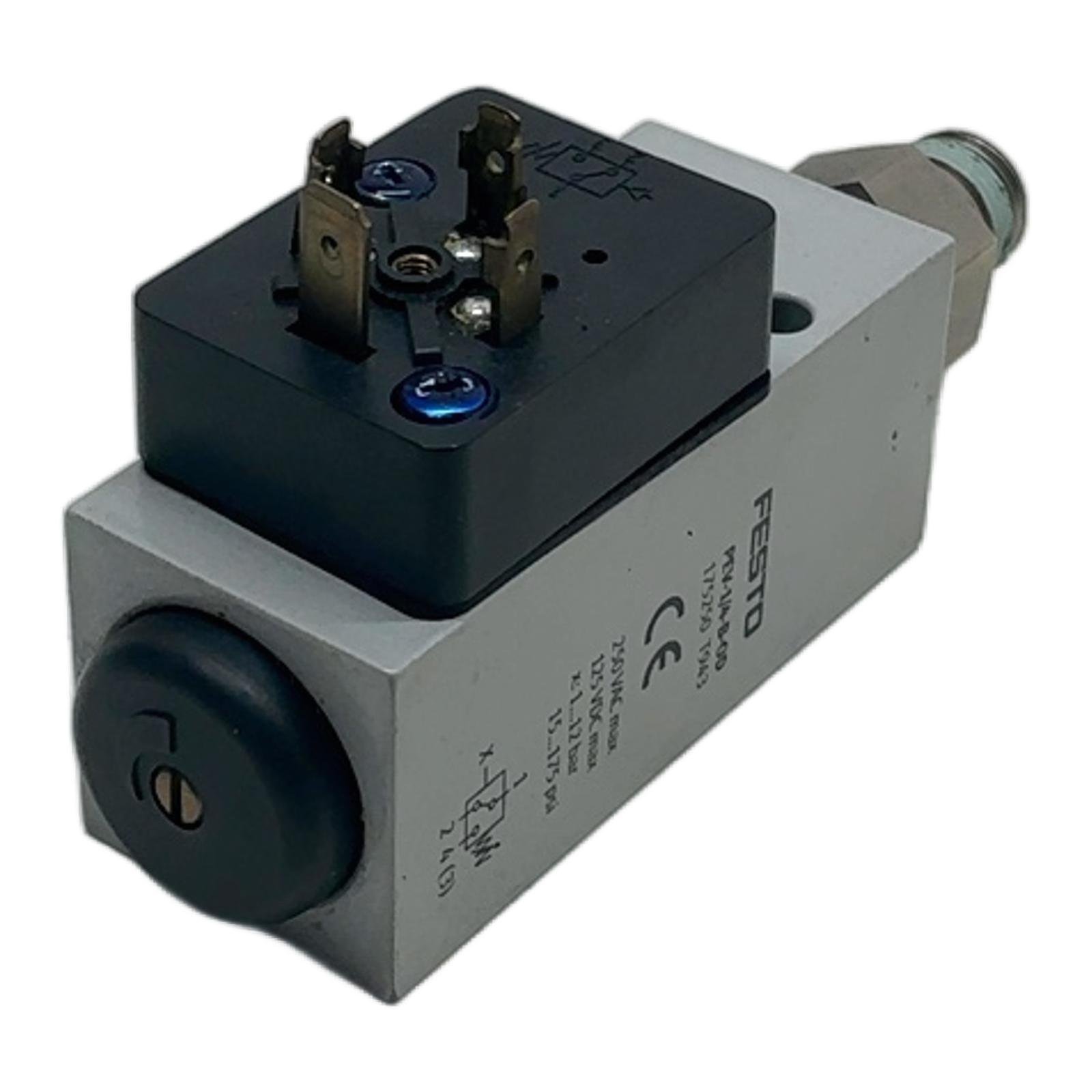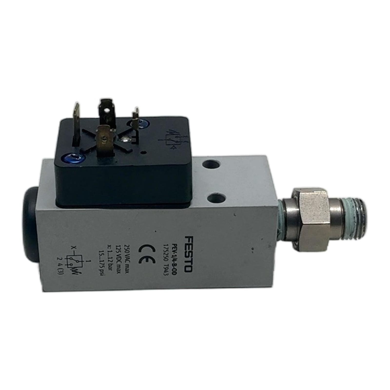 Festo PEV-1/4-B-OD Pneumatic Pressure Switch Description The Festo PEV-1/4-B-OD, part number 175250, is a high-quality mechanical pressure switch designed for monitoring pressure levels in pneumatic systems. It provides a reliable electrical signal when a preset pressure is reached. This component is known for its durability and precision, making it suitable for a wide range of industrial applications including process control, safety functions, and system monitoring. Specifications Manufacturer: Festo Type: PEV-1/4-B-OD Part Number: 175250 Operating Pressure: 1 to 12 bar (15 to 175 psi) Pneumatic Connection: G1/4 Switching Function: Changeover switch Maximum Voltage: 250V AC / 125V DC Label Info Model: PEV-1/4-B-OD Part No: 175250 T943 Pressure Range: 1…12 bar / 15…175 psi Application The PEV-1/4-B-OD pressure switch is used in automation technology to convert a pneumatic pressure signal into an electrical signal. It is commonly used for monitoring minimum pressure levels, confirming clamping or pressing operations, and controlling actuators based on system pressure. Country of Origin This product is manufactured by Festo in Germany. CO2 Impact By choosing to reuse this component, you are avoiding approximately 3.8 kg of CO2 emissions that would be generated from manufacturing a new one. This sustainable choice helps reduce industrial waste and conserves valuable resources. Availability This product is an obsolete component from Festo but is available from our stock. A modern functional equivalent is the Festo SPAB series pressure sensor. Order now from profideals for expert support and fast delivery. FAQ Question?What is the switching function of the PEV-1/4-B-OD? Answer:This pressure switch functions as a changeover switch, providing both normally open (NO) and normally closed (NC) contacts. Question?How do I adjust the switching pressure point on this device? Answer:The switching pressure is adjusted using the setting screw, which is typically located under the protective cap. Turning the screw changes the pre-tension on the internal spring, thereby setting the pressure threshold. Question?Is this pressure switch suitable for use with vacuum? Answer:No, the specified operating range is from 1 to 12 bar. It is designed for positive pressure applications and is not suitable for measuring or switching at vacuum levels. profideals is not an authorized distributor, reseller or representative of the products featured on this website. All product names, trademarks, brands and logos used on this site are the property of their respective owners. Last Update: Friday, March 13, 2026