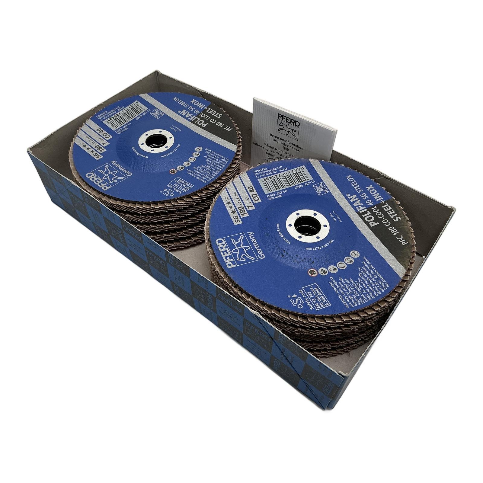 Abrasive flap discs Product Description This is a pack of 10 high-performance POLIFAN PFC flap discs from PFERD, model PFC 180 CO-COOL 40 SG STEELOX. Engineered in Germany, these discs are specifically designed for demanding work on steel and stainless steel. The innovative CO-COOL grinding-active layer ensures optimal results, especially on materials with poor thermal conductivity. Product Specifications – Manufacturer: PFERD – Product Line: POLIFAN-CURVE – Type: PFC 180 CO-COOL 40 SG STEELOX – Abrasive: Ceramic Oxide (CO) with cooling layer (COOL) – Grit: 40 – Diameter: 180 mm (7 inches) – Bore Size: 22.23 mm (7/8 inch) – Application: Steel and Stainless Steel (INOX) – Max. Rotational Speed: 8,500 RPM – Max. Peripheral Speed: 80 m/s – Backing Plate: SG (Steelflex – Glass fibre) – HS Item Description: Abrasive flap discs – HS Code (Commodity Code): 68051000 Product Label Info Model Code / Product Markings: PFC 180 CO-COOL 40 SG STEELOX EAN (GTIN-13): 4007220725481 Application Ideal for working on steel and stainless steel, especially fillet welds. Country of Origin This product is manufactured in Germany. Method of Application Ensure proper ventilation and use with appropriate safety gear. Safety Instructions Handle with care and follow safety guidelines for abrasive products. Availability Order now from profideals, items in stock and ready for fast worldwide delivery. Need urgent and express delivery, sourcing, or repairs? Contact us now. Documentation Official datasheet or product page Pferd Resources Additional resources and manuals are available upon request. Contact us for details. Internal & External Links All products from Pferd Explore similar products in Tools and Maintenance Frequently Asked Questions What is the Abrasive flap discs used for? This part is typically used for demanding work on steel and stainless steel, providing aggressive material removal and a long service life. What are the key advantages of Abrasive flap discs? The CO-COOL grinding-active layer reduces heat build-up, preventing heat discolouration and ensuring optimal results. Is PFC 180 CO-COOL 40 SG STEELOX compatible with my system? If you’re working with steel and stainless steel applications, this model will likely be compatible. Contact us to verify. Alternatives to PFC 180 CO-COOL 40 SG STEELOX Consider other PFERD flap discs for different grits and applications. Can I sell my surplus stock to profideals? Yes, profideals offers solutions for surplus stock recovery. Contact us for more information. Need Help? Call us at +31(0)165 20 11 80 or get in touch online. Last Update: 26/02/2026 profideals is not an authorized distributor of the products listed. Product names, trademarks, and logos belong to their respective owners. Our listings are for identification purposes only and do not imply affiliation or authorization.