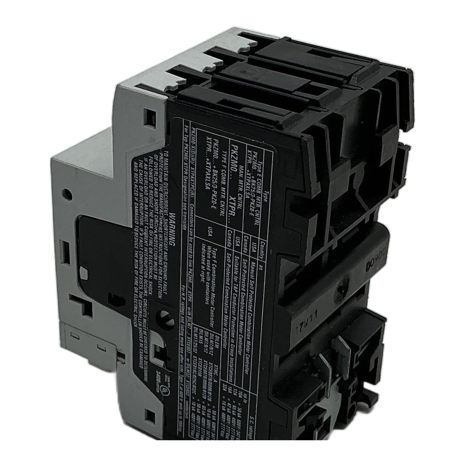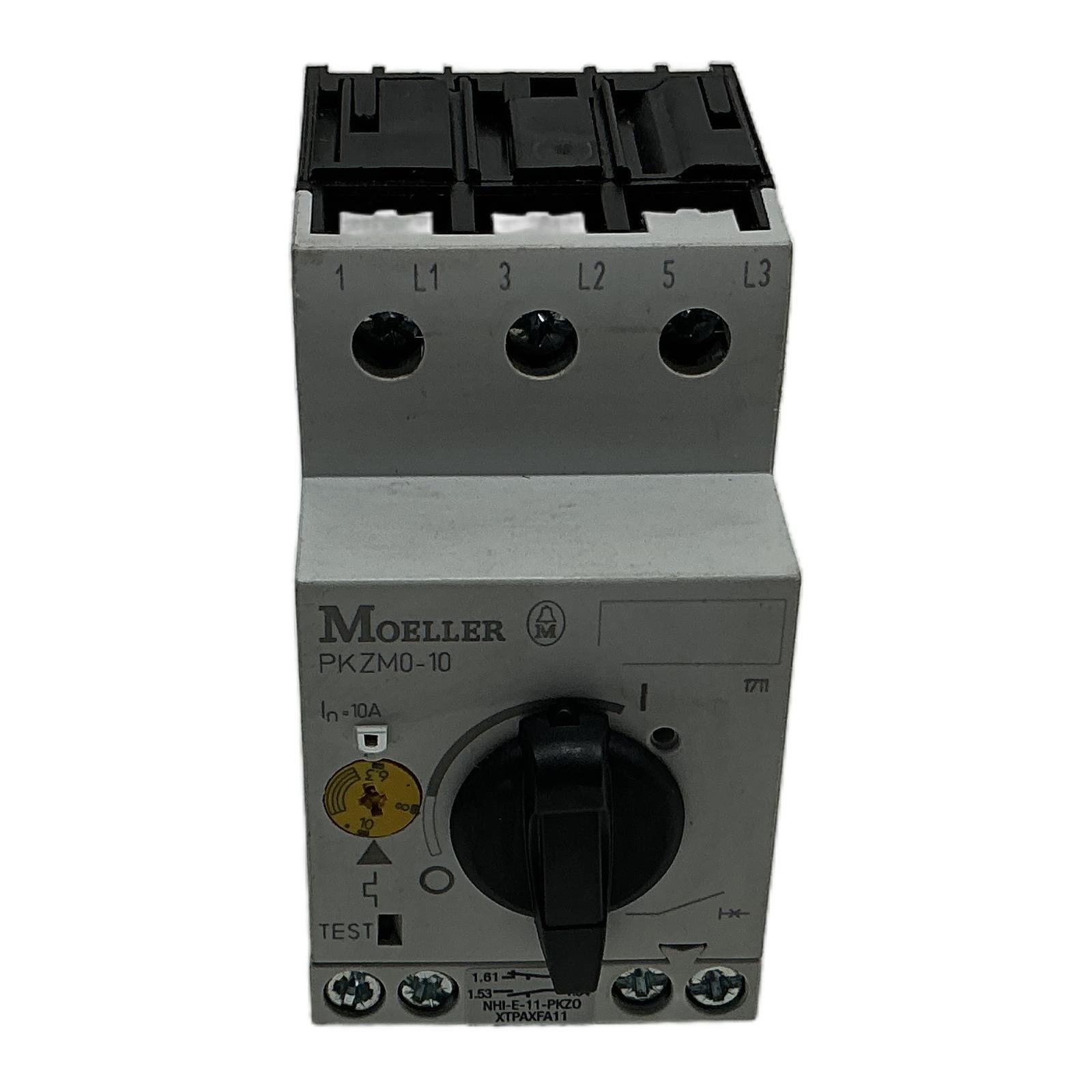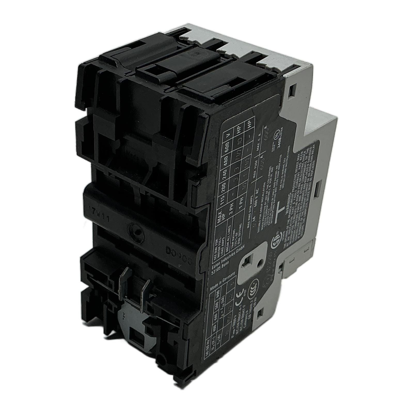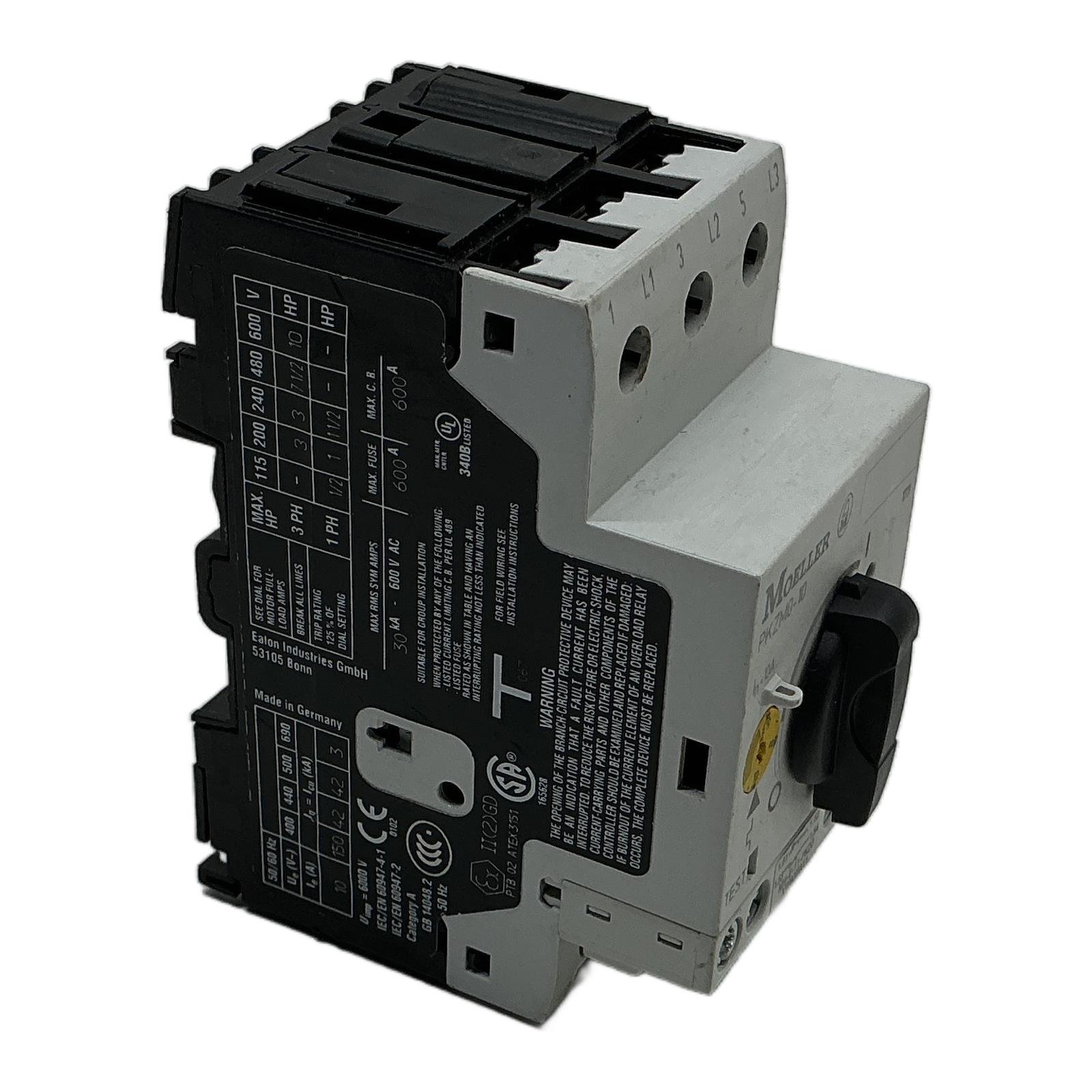 Moeller PKZM0-10 Motor Protective Circuit Breaker Description The Moeller PKZM0-10 is a manual motor starter designed for the protection of three-phase motors. It integrates both thermal overload protection, adjustable from 6.3 to 10 amps, and fixed magnetic short-circuit protection. This compact and reliable device is a staple in industrial control panels for its durability and precise performance. It features a rotary handle for manual operation and a clear trip indicator. Specifications Manufacturer: Moeller (Eaton) Type: PKZM0-10 Part Number: 072738 Product Type: Motor Protection Circuit Breaker Adjustable Current Range (Overload Release): 6.3 – 10 A Rated Operational Voltage: 690V AC Rated Uninterrupted Current (In): 10 A Trip Technology: Thermal-Magnetic Number of Poles: 3 Mounting Style: DIN Rail Label Info Standards: IEC/EN 60947-4-1, IEC/EN 60947-2, UL, CSA Certifications: CE, EX II(2)GD Uimp: 6000 V Application Ideal for protecting small to medium-sized motors in a variety of industrial applications, including conveyor systems, pumps, fans, and machine tools. It provides essential protection against overloads and short circuits, preventing motor damage and downtime. Country of Origin Made in Germany. CO2 Impact Opting for this pre-owned unit prevents the emission of approximately 11.2 kg of CO2, which is associated with the manufacturing of a new device. This choice supports sustainable industrial practices. Availability This item is in stock and ready for immediate dispatch. Order now from profideals for expert support and fast delivery. FAQ What is the adjustable current range for the PKZM0-10?The thermal overload protection is adjustable via the yellow dial on the front, with a range from 6.3 Amperes to 10 Amperes. Can this circuit breaker be used for single-phase motors?Yes, it can protect single-phase motors. For correct thermal protection, it is recommended to wire all three poles of the breaker in series with the motor load. What is the difference between the thermal and magnetic trip functions on this device?The thermal protection is a bimetallic strip that responds to sustained overcurrents (overloads) over time. The magnetic protection is an electromagnet that responds instantly to very high currents typical of a short circuit, ensuring rapid disconnection to prevent damage. profideals is not an authorized distributor, reseller or representative of the products featured on this website. All product names, trademarks, brands and logos used on this site are the property of their respective owners. Last Update: Friday, March 13, 2026