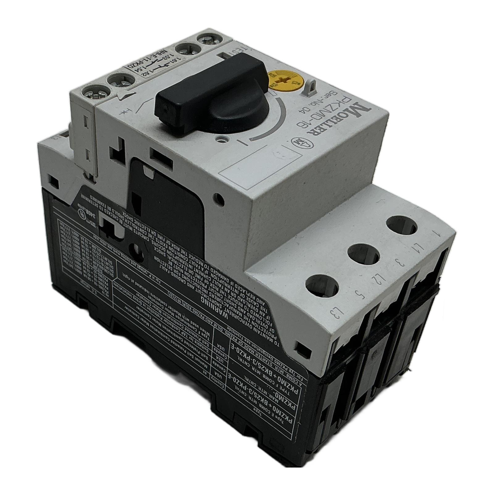 Moeller PKZM0-16 Motor Protection Circuit Breaker with Auxiliary Contact Description This is a Moeller PKZM0-16, a high-quality motor protection circuit breaker designed for reliable and precise protection of electric motors. It features an adjustable thermal overload setting and an instantaneous magnetic trip for short-circuit protection. This unit comes complete with a front-mounted NHI-E-11-PKZ0 auxiliary contact block, providing additional signaling capabilities. As part of the Eaton family, this component ensures robust performance in demanding industrial environments. Specifications Manufacturer: Moeller (Eaton) Model: PKZM0-16 Auxiliary Contact: NHI-E-11-PKZ0 (1 NO + 1 NC) Adjustable Current Range: 10 A to 16 A Rated Voltage (Ue): Up to 690 V AC Rated Impulse Withstand Voltage (Uimp): 6000 V Mounting: DIN Rail Number of Poles: 3 Label Info IEC/EN 60947 UL Listed 340B, CSA Certified PTB 02 ATEX 3151 Application Ideal for manual starting and stopping of motors, as well as providing fuseless protection against overloads and short circuits. Commonly used in conveyor systems, pumps, fans, and other machine-building applications. Country of Origin Made in Germany. CO2 Impact Choosing this pre-owned motor protector over a new one avoids the emission of approximately 14.0 kg of CO2, a saving comparable to driving a car for 70 kilometers. Availability This item is in stock and ready for immediate dispatch. Order now from profideals for expert support and fast delivery. FAQ What is the adjustable current range for the PKZM0-16? The PKZM0-16 has a setting range for the thermal overload release from 10 Amperes to 16 Amperes. This is adjusted via the dial on the front of the device to match the motor’s full-load current. Can the NHI-E-11-PKZ0 auxiliary contact be replaced or removed? Yes, the NHI-E-11-PKZ0 is a modular, front-mounting auxiliary contact. It can be easily removed or replaced with other compatible contact blocks from the Eaton PKZ0 series to suit different signaling requirements. Is this PKZM0-16 suitable for use in North America? Yes, the product label clearly shows UL (Underwriters Laboratories) and CSA (Canadian Standards Association) certification marks, making it suitable for installation in both the USA and Canada, in compliance with local electrical codes. profideals is not an authorized distributor, reseller or representative of the products featured on this website. All product names, trademarks, brands and logos used on this site are the property of their respective owners. The depiction, description or sale of products featuring these names, trademarks, brands and logos is for identification purposes only and is not intended to indicate any affiliation with or authorization by any rights holder. Friday, March 13, 2026