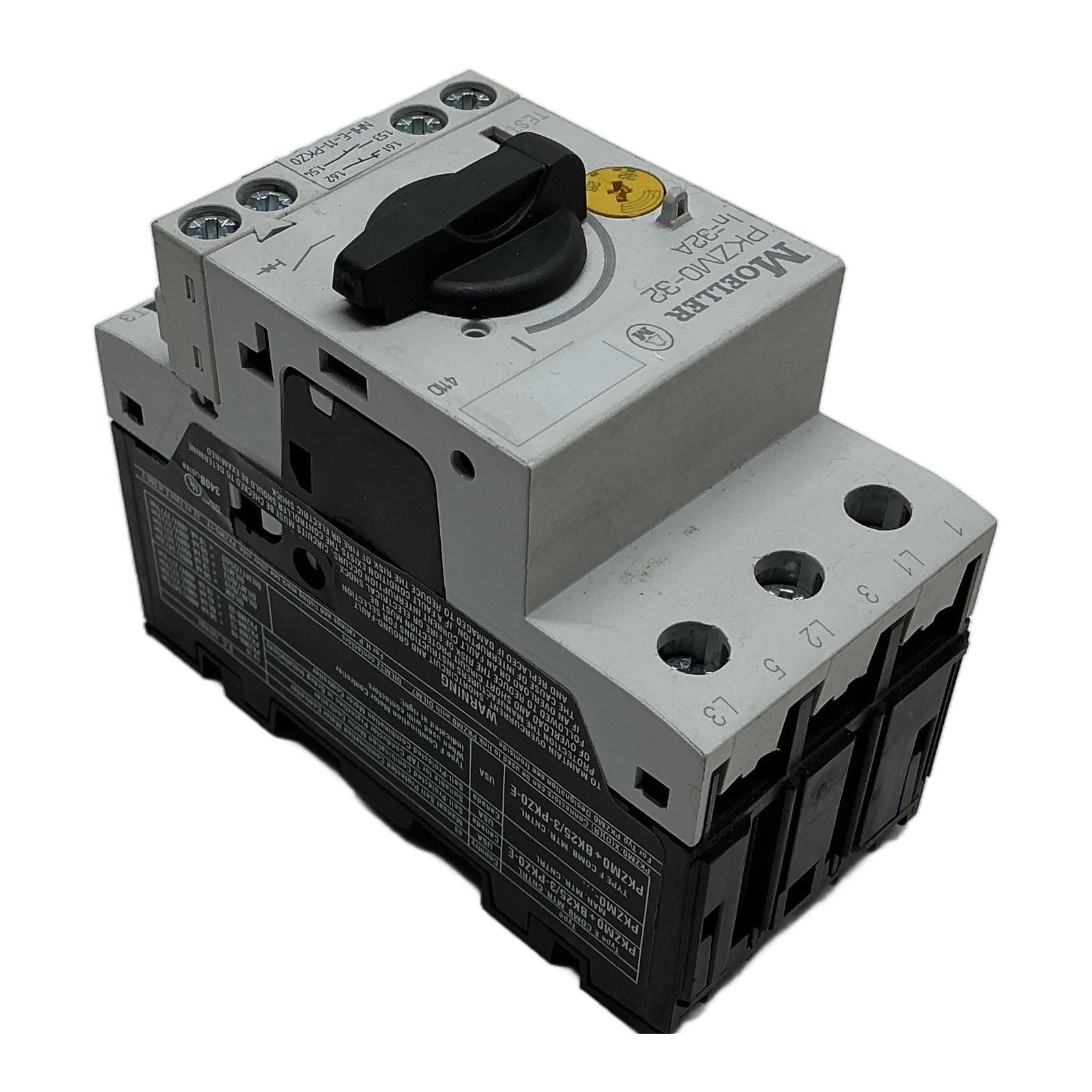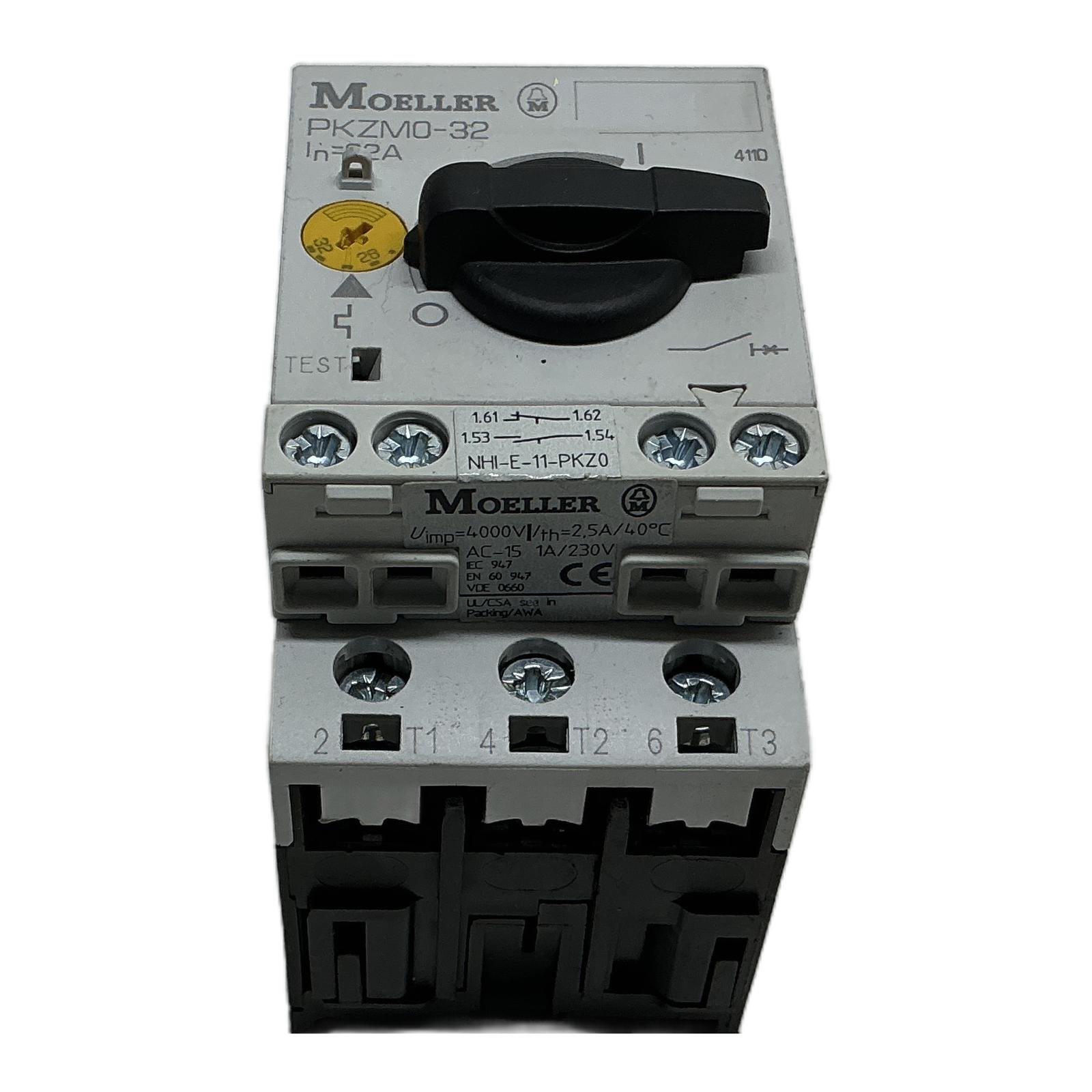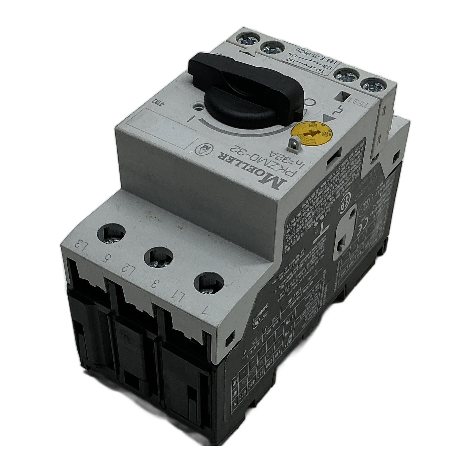 Moeller PKZMO-32 Motor Protective Circuit Breaker Description The Moeller PKZMO-32 is a high-performance 3-pole motor protective circuit breaker designed to offer comprehensive protection for electric motors. It features an adjustable thermal overload release and a fixed magnetic short-circuit release. This device is built for durability and reliability in demanding industrial environments, ensuring the safety and longevity of your motor-driven equipment. It is compliant with major international standards, including IEC/EN 60947, UL, and CSA. Specifications Manufacturer: Moeller (An Eaton Brand) Type: PKZMO-32 Function: Motor Protective Circuit Breaker Number of Poles: 3 Rated Current (In): 32 A Setting Range (Overload Release): 25 – 32 A Rated Operational Voltage (Ue): up to 690V AC Short-circuit breaking capacity (Icu) at 400V: 50 kA Label Info Model: PKZMO-32 Nominal Current: In=32A Standards: IEC/EN 60947-4-1, IEC/EN 60947-2, UL 508, CSA C22.2 No. 14 Application This motor protective circuit breaker is ideal for direct-on-line starting and protection of three-phase squirrel cage motors. It is commonly used in applications such as conveyor systems, pumps, fans, and other industrial machinery where reliable motor protection is critical. Country of Origin Made in Germany. CO2 Impact By purchasing this refurbished component, you are actively contributing to the circular economy and helping to prevent 14 kg of CO2 emissions. This saving is equivalent to the emissions from driving a car for approximately 70 kilometers. Availability This unit is in stock and ready for immediate dispatch. Order now from profideals for expert support and fast delivery. FAQ What is the overload setting range for this PKZMO-32? The Moeller PKZMO-32 has a nominal current of 32A and features an adjustable thermal overload release. The typical setting range for this model is from 25A to 32A, allowing for precise protection tailored to your specific motor’s full-load current. Is this circuit breaker suitable for both IEC and NEMA applications? Yes, the PKZMO-32 is designed to meet global standards. It complies with IEC/EN 60947 and is also UL listed and CSA certified (marked as SP), making it suitable for use in both European (IEC) and North American (NEMA) control panels. Can I add auxiliary contacts or a shunt trip to this device? Absolutely. The PKZMO series is modular. You can easily add front-mounted or side-mounted auxiliary contacts (like the NHI-E series) and other accessories such as undervoltage releases or shunt trips to enhance its functionality. profideals is not an authorized distributor, reseller or representative of the products featured on this website. All product names, trademarks, brands and logos used on this site are the property of their respective owners. Last Update: Friday, March 13, 2026