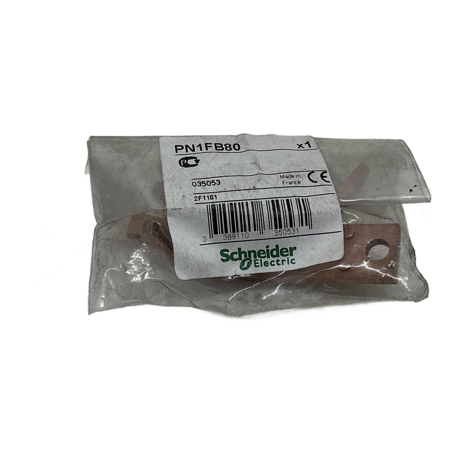 Schneider Electric PN1FB80 Flat Terminal Set Description The Schneider Electric PN1FB80 is a set of two flat terminals designed for use with the FuPact ISFT range of switch-disconnectors. This essential accessory provides a secure and reliable method for connecting cables to devices rated from 80A to 160A. The kit includes all necessary hardware for installation, ensuring optimal electrical contact and safety in your power distribution systems. Specifications Manufacturer: Schneider Electric Part Number: PN1FB80 / 035053 Product Type: Flat Terminal Set Compatibility: FuPact ISFT Switch-Disconnectors Current Rating: 80A to 160A Quantity: Set of 2 terminals with mounting hardware Label Info Brand: Schneider Electric Model: PN1FB80 Ref: 035053 EAN: 3389110350531 Application This terminal set is specifically used in industrial and commercial electrical panels to provide connection points for power cables on Schneider Electric FuPact ISFT switch-disconnectors, ensuring safe and efficient power management. Country of Origin Made in France. CO2 Impact Opting for this reused component prevents the emission of approximately 6.0 kg of CO2, which is comparable to the savings from not driving a car for 30 km. Availability This item is in stock and ready for immediate dispatch. Order now from profideals for expert support and fast delivery. FAQ What specific switch-disconnector series is the PN1FB80 compatible with? The PN1FB80 terminal set is specifically designed as an accessory for the Schneider Electric FuPact ISFT series of switch-disconnectors with a current rating from 80A to 160A. What is the maximum cable size or lug type that can be connected to these flat terminals? These flat terminals are designed for direct connection or for use with cable lugs. The appropriate size depends on the cable cross-section required for the 80-160A current range. Always consult the FuPact ISFT installation manual for specific torque values and recommended lug specifications. Does this kit include the mounting hardware? Yes, the PN1FB80 kit includes two flat terminals and the necessary screws and washers for mounting them onto the FuPact ISFT device, as shown in the product image. profideals is not an authorized distributor, reseller or representative of the products featured on this website. All product names, trademarks, brands and logos used on this site are the property of their respective owners. Last Update: Friday, March 13, 2026