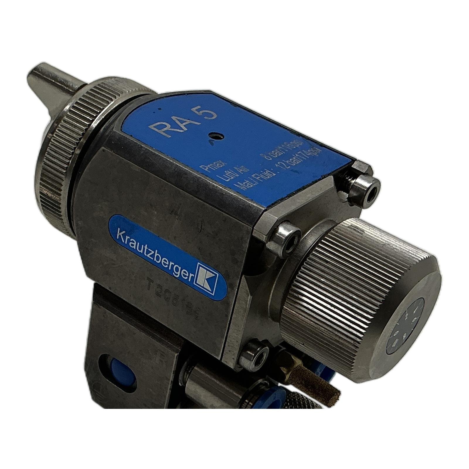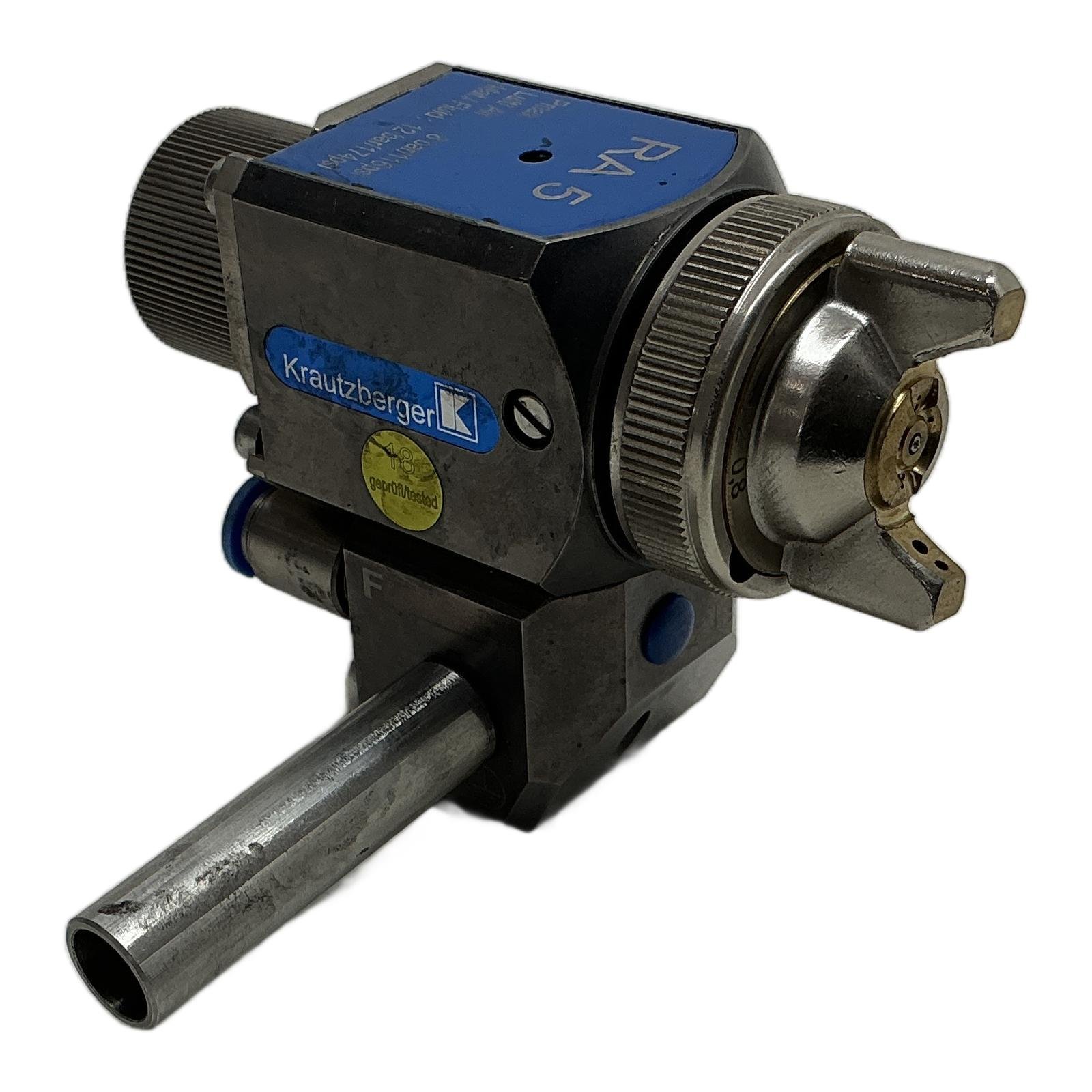 Krautzberger RA 5 Automatic Spray Gun Description The Krautzberger RA 5 is a compact and robust automatic spray gun designed for integration into automated production lines. It provides excellent atomization quality and high transfer efficiency. This unit is equipped with a 0.8mm nozzle and is suitable for a wide range of sprayable media. Its precise controls for material flow and spray pattern allow for repeatable, high-quality finishes. Specifications Manufacturer: Krautzberger Model: RA 5 Nozzle Size: 0.8 mm Maximum Air Pressure: 8 bar (116 psi) Maximum Fluid Pressure: 12 bar (174 psi) Control Connections: Pneumatic push-in fittings Adjustments: Material flow, Round/flat spray pattern Label Info Pmax Luft/Air: 8 bar / 116psi Pmax Mat./Fluid: 12 bar / 174psi Serial: T205186 Application Ideal for automated surface coating, marking, and application of adhesives or release agents in industries such as automotive, woodworking, and general manufacturing. Country of Origin Made in Germany. CO2 Impact By purchasing this refurbished item, you are contributing to a circular economy and saving approximately 15 kg of CO2 emissions compared to a new purchase. Availability This item is in stock and ready for immediate dispatch. Order now from profideals for expert support and fast delivery. FAQ What types of fluids can be used with the Krautzberger RA 5? The RA 5 is versatile and can handle a wide range of low to medium viscosity fluids, including solvent-based and water-based paints, lacquers, glazes, adhesives, and release agents. Always check material compatibility with the gun’s wetted parts, which are typically stainless steel. How do I adjust the spray pattern from round to flat spray? The spray pattern is adjusted via a dedicated pneumatic control connection, often labeled ‘R’ or with a symbol. Applying or releasing control air to this port switches the air cap between a round spray pattern for edges and small areas, and a flat (fan) spray pattern for larger surfaces. What is the recommended cleaning procedure for this spray gun to ensure longevity? For optimal performance, flush the gun with a suitable solvent immediately after use. Disassemble the nozzle, needle, and air cap for a more thorough cleaning, using soft brushes to avoid damaging precision parts. Never use hard or sharp metal tools. Ensure all passages are clear before reassembly. profideals is not an authorized distributor, reseller, or representative of the products featured on this website. All product names, trademarks, brands, and logos used on this site are the property of their respective owners. Last Update: Friday, March 13, 2026