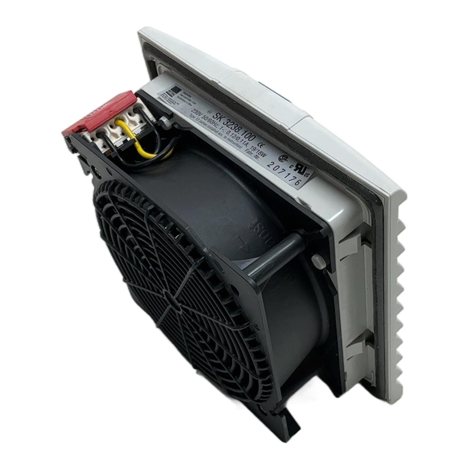 Rittal SK 3238.100 Filter Fan for Enclosure Climate ControlDescriptionThe Rittal SK 3238.100 is a high-quality fan-and-filter unit designed to ensure optimal operating conditions within electrical enclosures. It effectively dissipates heat loads while the integrated filter prevents dust and dirt ingress, protecting sensitive components. This model is engineered for simple, tool-free installation and reliable, continuous operation.SpecificationsManufacturer: RittalPart Number: SK 3238.100Rated Voltage: 230V ACFrequency: 50 / 60 HzPower Consumption: 19W (50Hz) / 18W (60Hz)Air Throughput (unimpeded): 55 m3/h (50Hz) / 65 m3/h (60Hz)Dimensions (W x H): 148.5 mm x 148.5 mmMounting Cutout (W x H): 124 mm x 124 mmProtection Category: IP54 according to EN 60 529Label InfoModel: SK 3238.100Voltage: 230V 50/60HzCurrent: 0.12A / 0.11APower: 19W / 18WApplicationIdeal for use in control cabinets, switchgear, and network enclosures across various industries, including manufacturing, automation, and IT infrastructure, to maintain safe operating temperatures.Country of OriginGermanyCO2 ImpactBy choosing this pre-owned Rittal fan unit, you are preventing the emission of approximately 28 kg of CO2. This is equivalent to the carbon savings of driving a standard car for 140 kilometers.AvailabilityThis item is in stock and ready for immediate dispatch. Order now from profideals for expert support and fast delivery.FAQWhat is the required cutout size for mounting the SK 3238.100?The required mounting cutout for this fan unit is 124 mm x 124 mm. Always consult the installation manual for precise measurements and tolerances.Can the direction of airflow be reversed on this fan unit?Yes, the airflow direction can be reversed. This is achieved by simply turning the fan module 180 degrees within the housing before snapping it into place.What type of filter mat is compatible with the SK 3238.100?This unit is compatible with standard Rittal filter mats designed for this size, typically part number SK 3171.100 or SK 3321.107 for finer filtration (F5 grade).Last updated: Friday, March 13, 2026PLC2DAY is not an authorized distributor, reseller or representative of the products featured on this website. All product names, trademarks, brands and logos used on this site are the property of their respective owners.