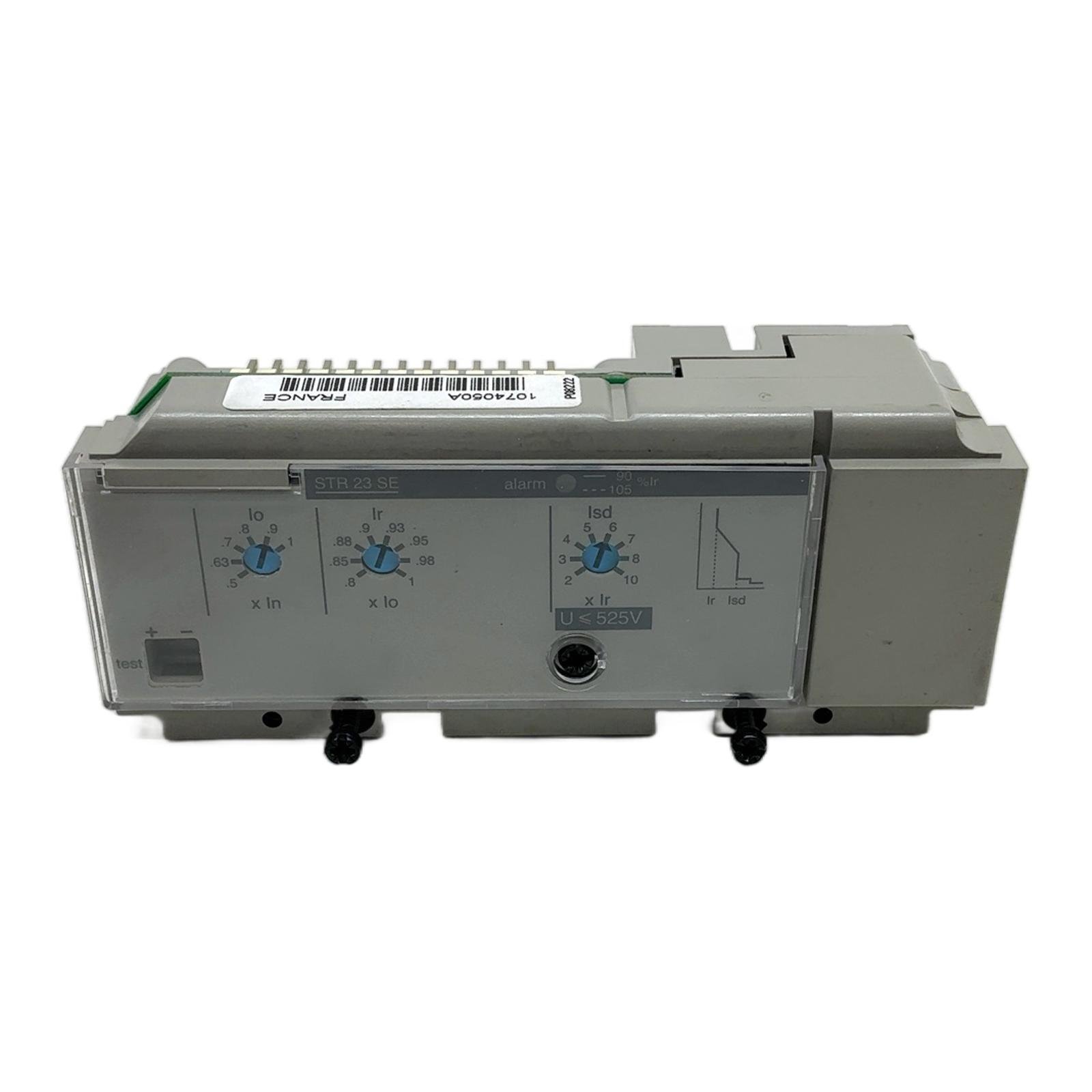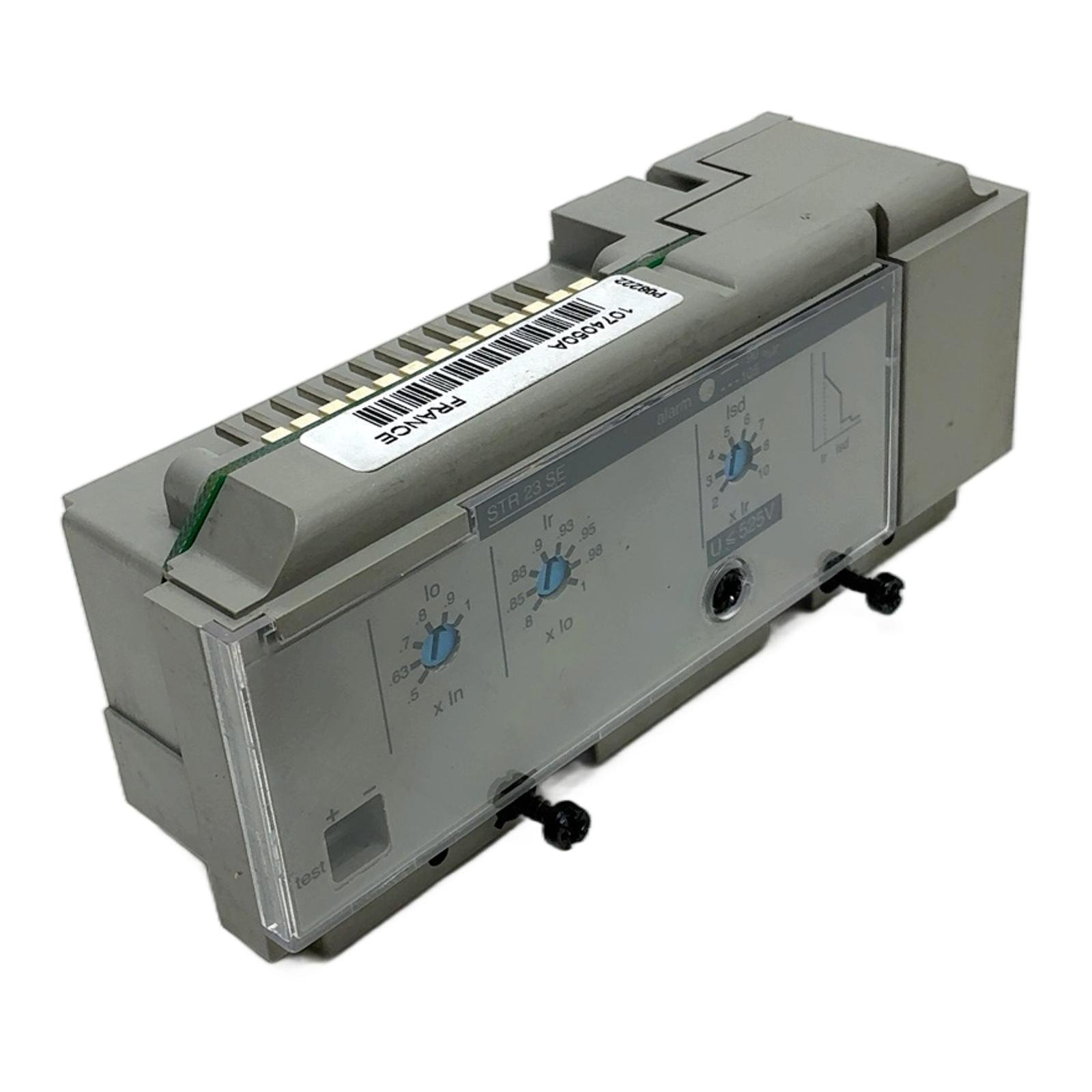 Schneider Electric STR 23 SE Trip Unit for Compact NS Breakers Description The STR 23 SE is an electronic trip unit from Schneider Electric’s Merlin Gerin line, designed to provide reliable overcurrent protection for Compact NS molded case circuit breakers. This unit offers adjustable settings for both overload (long-time) and short-circuit (short-time) protection, making it a versatile component for various industrial electrical distribution systems operating at up to 525V. Specifications Manufacturer: Schneider Electric (Merlin Gerin) Model: STR 23 SE Part Number: 1074050A Type: Electronic Trip Unit Rated Voltage (U): Up to 525V Protection Functions: Overload (Long-time, Ir), Short-circuit (Short-time, Isd) Compatibility: Designed for Compact NS100, NS160, NS250 circuit breakers Label Info Model: STR 23 SE Part Number: 1074050A Voltage: U