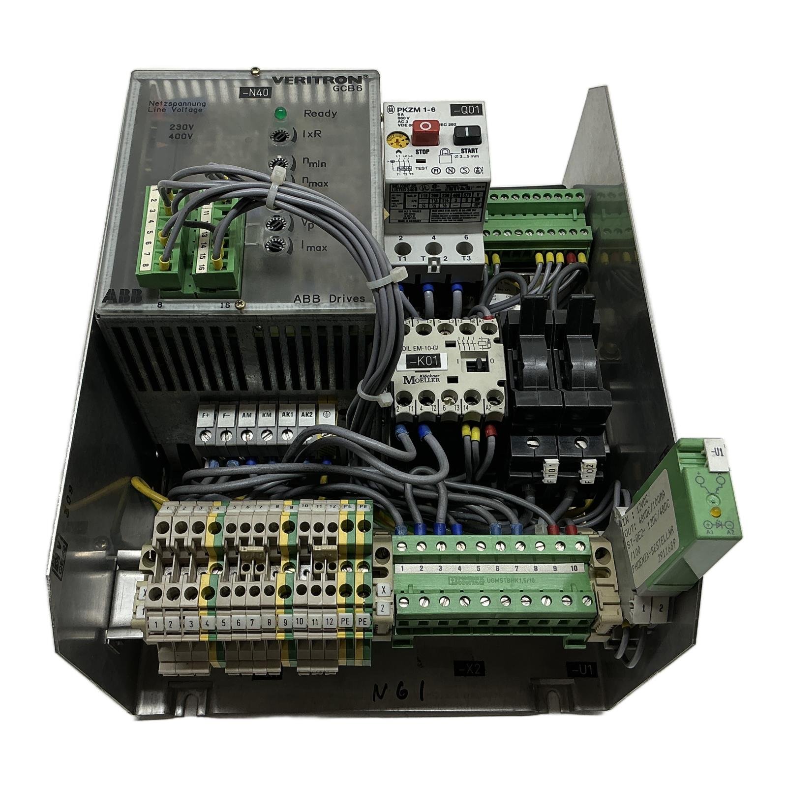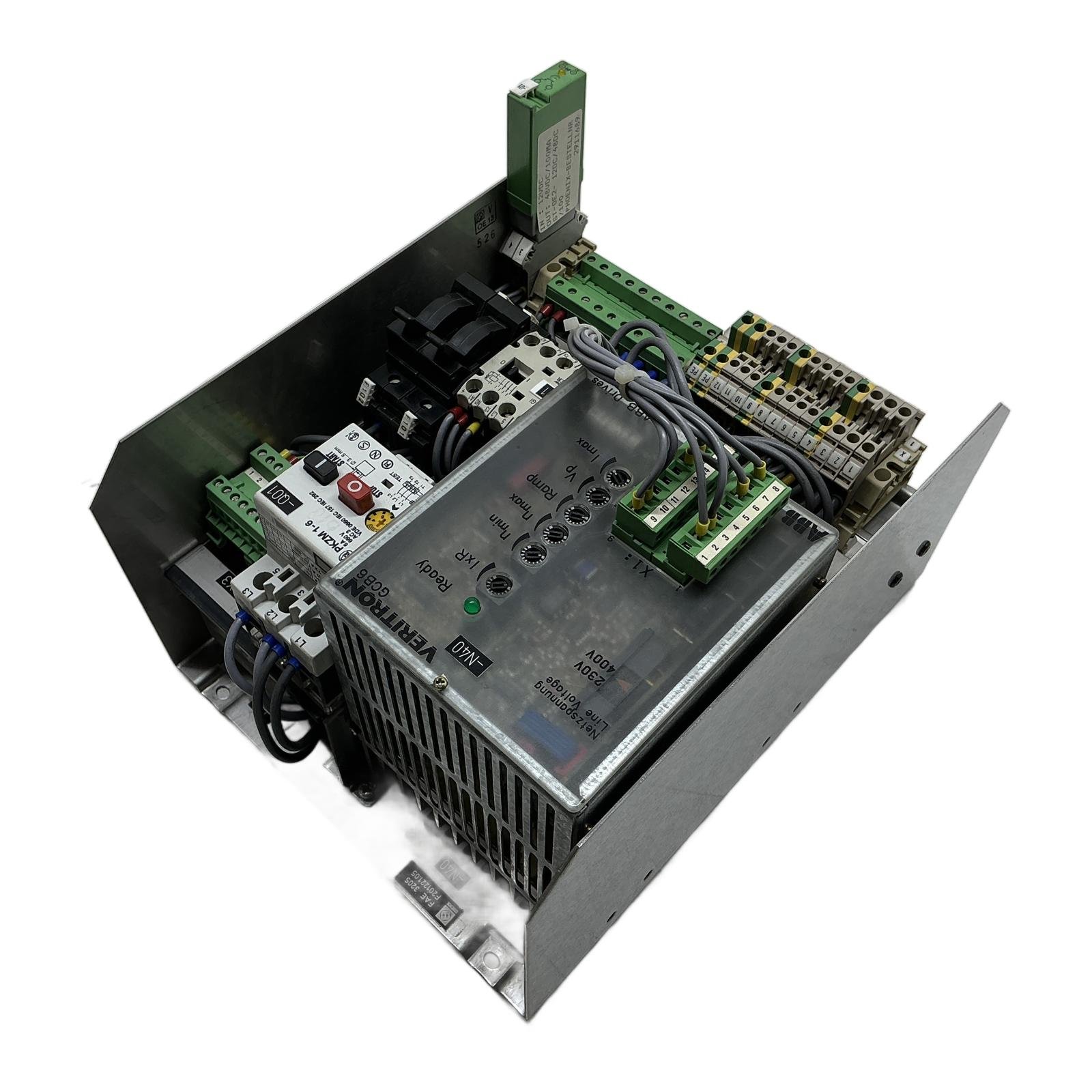 ABB VERITRON GCB6 DC Motor Control Unit Description This is a complete, pre-assembled control unit featuring the robust ABB VERITRON GCB6 DC motor controller. Housed in a durable metal chassis, this assembly integrates essential control components, including a Klockner-Moeller motor protector and contactor, making it a ready-to-install solution for various DC motor applications. It offers analog control over motor parameters such as speed, ramp, and current, ideal for replacing obsolete systems or for new, straightforward installations. Specifications Main Drive: ABB VERITRON GCB6 Input Voltage: Selectable 230V / 400V Motor Protector: Klockner-Moeller PKZM 1-6 (Adjustable 4-6A) Contactor: Moeller DIL M-10 Adjustments: IxR, nmin, nmax, Ramp, Imax Mounting: Metal chassis with terminal blocks for easy wiring Label Info Manufacturer: ABB Drives Primary Model: VERITRON GCB6 Integrated Components: Klockner-Moeller PKZM 1-6, Moeller DIL M-10, Elesta SGR 282 Relay Application Suitable for controlling small-scale permanent magnet or shunt-wound DC motors in applications such as conveyors, mixers, pumps, and other legacy industrial machinery requiring reliable analog speed control. Country of Origin Germany CO2 Impact By purchasing this refurbished assembly, you are helping to avoid the 88.0 kg of CO2 emissions associated with the production of a new one. This saving is comparable to the emissions from driving a standard car for 440 kilometers. Availability This is an obsolete product and is available as a tested, used item. Availability is limited. Order now from profideals for expert support and fast delivery. FAQ What type of DC motor is the Veritron GCB6 designed to control?The GCB6 is an analog, single-phase thyristor drive typically used for controlling permanent magnet or shunt-wound DC motors. It provides a variable DC voltage to control the motor’s speed. How do I switch the input voltage between 230V and 400V?The input voltage selection is typically done by changing the connections on the internal transformer or specific terminals as indicated by a wiring diagram. Always consult the technical manual for this specific model before changing the line voltage to prevent damage. The assembly includes a Moeller PKZM 1-6. What is its function and setting range?The PKZM 1-6 is a motor protection circuit breaker. It provides thermal overload protection (adjustable from 4A to 6A) and short-circuit protection for the connected motor. It acts as the main switch and safety disconnect for the motor circuit. Friday, March 13, 2026 profideals is not an authorized distributor, reseller or representative of the products featured on this website. All product names, trademarks, brands and logos used on this site are the property of their respective owners.