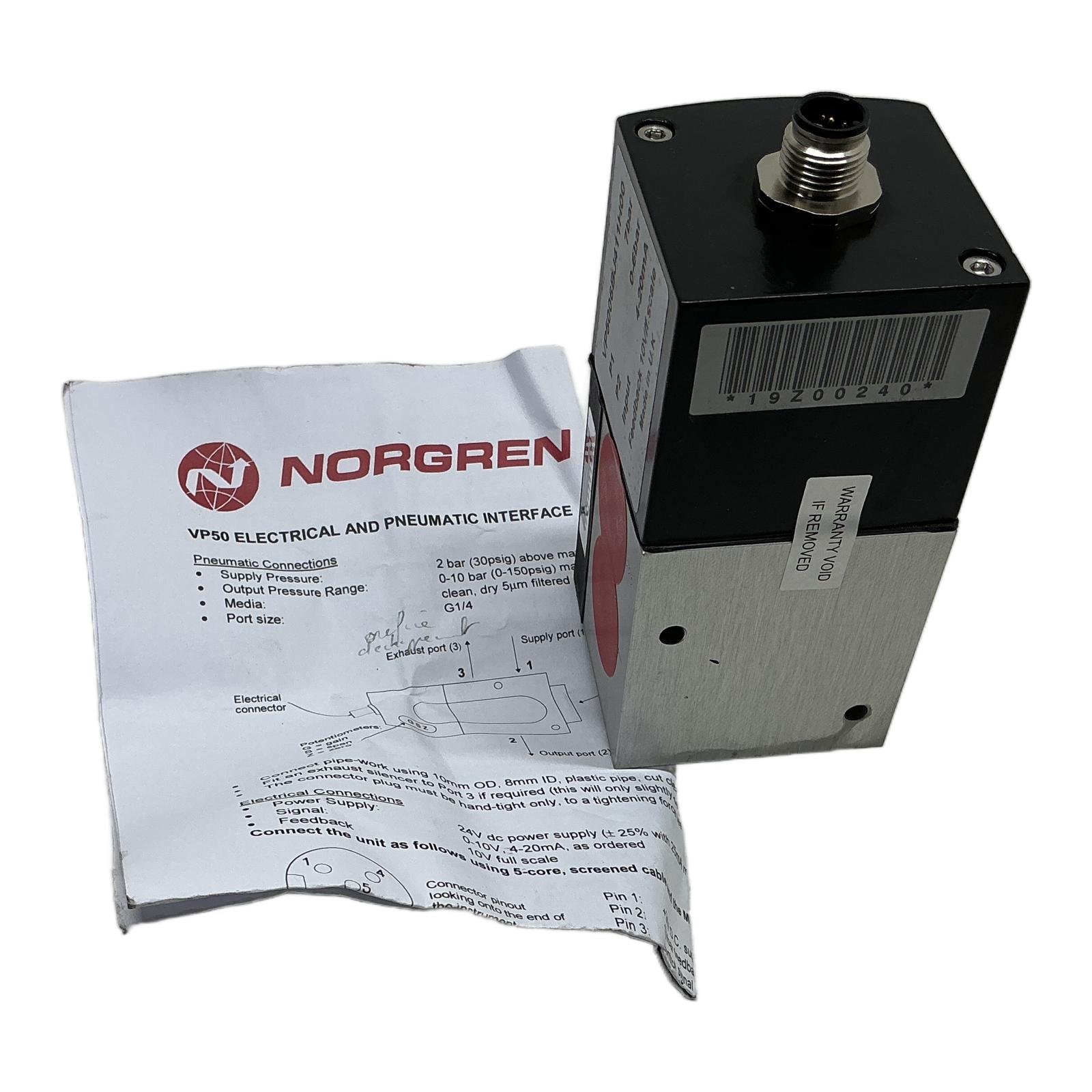 IMI Norgren VP50 Proportional Pressure Control Valve Description The VP5006BJ411H00 is an electro-pneumatic proportional pressure control valve from IMI Norgren’s trusted VP50 series. It accurately converts a 4-20mA electrical input signal into a highly stable and repeatable pneumatic output pressure between 0 and 6 bar. This unit is ideal for applications requiring precise and dynamic pressure control. It features a G1/4 port size, an M12 4-pin connector, and provides a 0-10V feedback signal for process monitoring. Order now from profideals for expert support and fast delivery. Specifications Manufacturer: IMI Norgren Series: VP50 Type: Proportional Pressure Control Valve Output Pressure Range: 0 to 6 bar Maximum Supply Pressure (P1): 7 bar Input Signal: 4-20mA Feedback Signal: 0-10V Full Scale Port Connection: G1/4 Electrical Connection: 4-pin M12 Operating Medium: Compressed air, filtered to 5um, non-lubricated Label Info Model: VP5006BJ411H00 P1: 7bar P2: 0-6bar Input: 4-20mA Feedback: 10V/f.scale Application This valve is suitable for a wide range of industrial applications, including tension control, robotics, material handling, and process control systems where precise regulation of air pressure is critical. Country of Origin Made in the U.K. CO2 Impact By purchasing this remanufactured component, you are actively contributing to the circular economy and have helped avoid approximately 32 kg of CO2 emissions associated with the production of a new part. Availability This item is in stock and ready for immediate dispatch. FAQ What is the required air quality for the VP5006BJ411H00?The supply air must be filtered to 5 micrometers (5um) and should be non-lubricated (oil-free). This ensures the longevity and accuracy of the internal valve components. How do I adjust the Gain and Span on this valve?The valve has potentiometers for Gain, Span, and Zero adjustments under a protective cover. The label indicates it is factory-calibrated for a 0.1L load volume. For different load volumes, you may need to adjust the Gain potentiometer to optimize response time and prevent oscillation. What do the input and feedback signals mean for my control system?The valve is controlled by a 4-20mA analog current signal from your PLC or controller. It provides a 0-10V analog voltage feedback signal, which is proportional to the actual output pressure. This feedback allows for closed-loop control and system monitoring to verify that the correct pressure is being delivered. profideals is not an authorized distributor, reseller or representative of the products featured on this website. All product names, trademarks, brands and logos used on this site are the property of their respective owners. Last Update: Friday, March 13, 2026