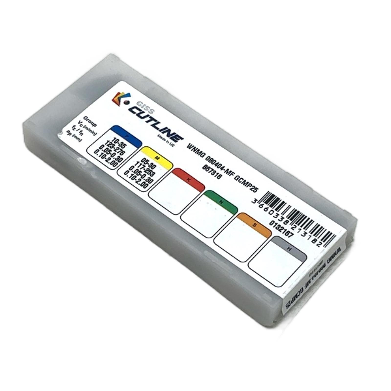 GISS Cutline WNMG 080404-MF GCMP25 Turning Inserts Description This is a box of 10 GISS Cutline carbide turning inserts, model WNMG 080404-MF with grade GCMP25. These are high-quality, general-purpose inserts designed for reliability and performance in a variety of turning applications. The WNMG shape provides 6 cutting edges per insert, making it a very economical choice. Specifications Manufacturer: GISS Product Line: Cutline ISO Code: WNMG 080404-MF Grade: GCMP25 Quantity: 10 Inserts Nose Radius: 0.4 mm Primary Application: Steel (ISO P), Stainless Steel (ISO M) Chipbreaker: MF (Medium Finishing) Label Info Part Number: 867316 EAN: 3660338213182 Application These inserts are ideal for CNC lathes and manual turning machines for finishing to medium roughing operations on steel and stainless steel components. The MF chipbreaker ensures good chip control across a range of cutting parameters. Country of Origin Made in the European Union. CO2 Impact Opting for this existing stock of inserts prevents the emissions of new production, saving an estimated 2.2 kg of CO2, comparable to driving a car for 11 km. Availability This item is in stock and ready for immediate dispatch. Order now from profideals for expert support and fast delivery. FAQ What materials is the GCMP25 grade best suited for?The GCMP25 grade is a versatile PVD-coated carbide grade primarily designed for finishing to medium machining of steel (ISO P material group) and stainless steel (ISO M material group). The provided cutting data on the box confirms its suitability for these materials.What does the ‘MF’ designation in WNMG 080404-MF mean?The ‘MF’ is the manufacturer’s code for the chipbreaker geometry. In this context, it typically stands for ‘Medium Finishing’. This chipbreaker is designed to provide good chip control at medium feed rates and depths of cut, making it a good general-purpose choice.Is this WNMG insert double-sided?Yes, the ‘W’ shape (trigon) combined with the ‘N’ (neutral/0 deg clearance) in the WNMG designation means the insert is double-sided. It has 3 cutting corners on each side, providing a total of 6 cutting edges per insert for excellent economy. Last Update: Friday, March 13, 2026 profideals is not an authorized distributor, reseller or representative of the products featured on this website. All product names, trademarks, brands and logos used on this site are the property of their respective owners.