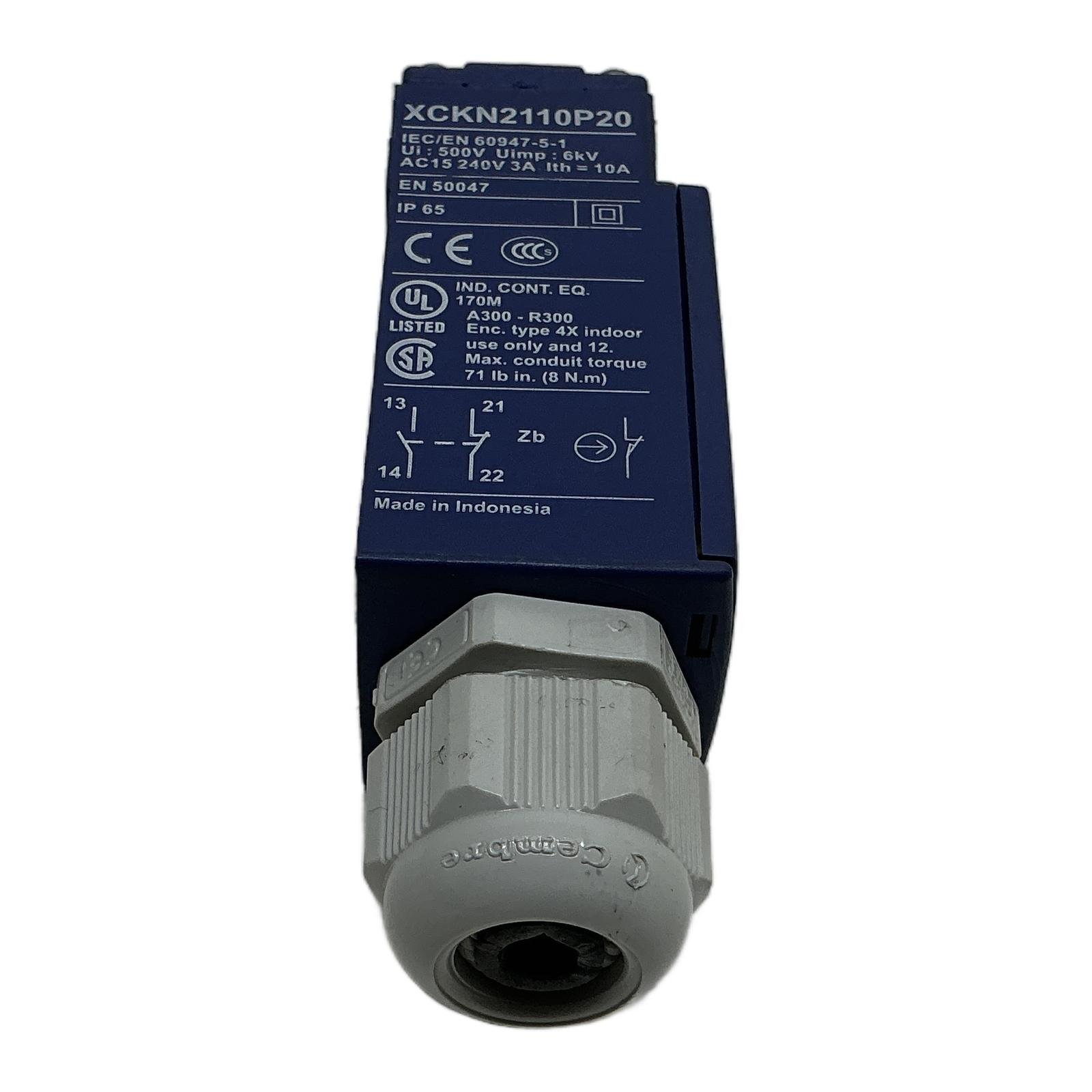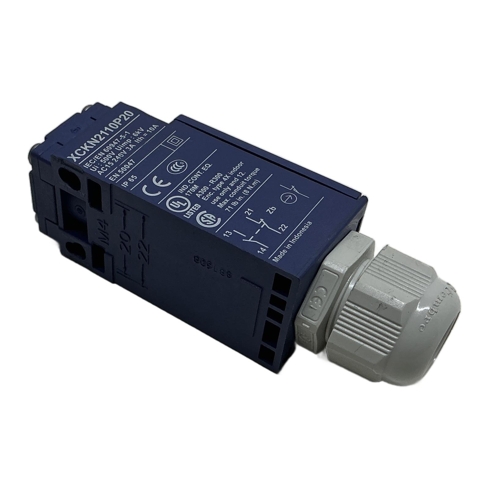 Telemecanique XCKN2110P20 Limit Switch Description The Telemecanique XCKN2110P20 is a compact and reliable limit switch from the OsiSense XC series. It is designed for standard-duty applications in industrial environments, providing accurate position feedback for machinery and automated systems. Its thermoplastic body offers good resistance to mechanical stress and chemical agents, and the pre-fitted M20 cable gland simplifies installation. Specifications Manufacturer: Telemecanique (Schneider Electric) Model: XCKN2110P20 Series: OsiSense XC Actuator Type: Plunger Contact Configuration: 1 NO + 1 NC Contact Action: Snap Action (Zb type) Rated Operational Current (AC-15): 3 A at 240 V Conventional Thermal Current (Ith): 10 A Rated Insulation Voltage (Ui): 500 V Ingress Protection: IP65 Cable Entry: 1 entry for M20 x 1.5 cable gland Label Info IEC/EN 60947-5-1 AC15 240V 3A Ui 500V, Uimp 6kV, Ith 10A Certifications: CE, UL, CSA (SP), CCC Application This limit switch is ideal for a wide range of applications, including packaging machines, conveyors, material handling equipment, and assembly lines where the detection of a part’s presence or position is critical for process control. Country of Origin Made in Indonesia. CO2 Impact Opting for a refurbished component like this one saves approximately 5.2 kg of CO2, which is comparable to the emissions saved by not driving a car for 26 kilometers. Availability This item is in stock and ready for immediate dispatch. Order now from profideals for expert support and fast delivery. FAQ Question? What is the difference between snap action and slow-break contacts in a limit switch? Answer: Snap-action contacts (like in the XCKN2110P20) change state rapidly, regardless of the actuator speed, providing a decisive switching action. Slow-break contacts open and close at a speed proportional to the actuator’s movement, which is suitable for some applications but can cause arcing with slow actuation. Question? Is the M20 cable gland included with this switch? Answer: Yes, as seen in the product photos, this XCKN2110P20 comes pre-fitted with a grey M20 plastic cable gland, ready for wiring installation. Question? What does the ‘Zb’ contact designation mean on the label? Answer: The ‘Zb’ symbol indicates snap-action contacts with one normally open (NO) and one normally closed (NC) circuit. Importantly, it signifies that the contacts are electrically separated, meaning they can be used in two different control circuits. profideals is not an authorized distributor, reseller or representative of the products featured on this website. All product names, trademarks, brands and logos used on this site are the property of their respective owners. Last Update: Friday, March 13, 2026