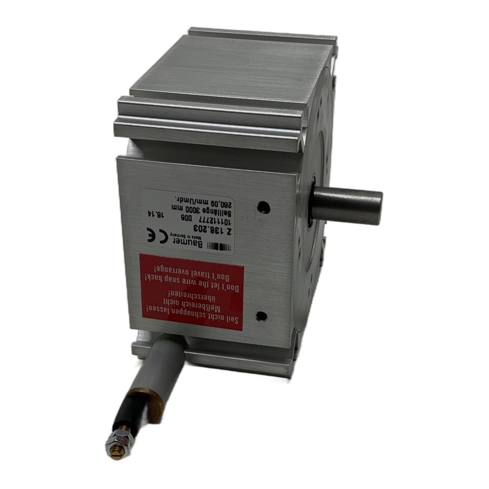 Baumer Wire Draw Encoder Mechanism Description The Baumer Z 136.203 is a high-precision wire draw mechanism, also known as a Seilzuggeber, designed for reliable linear position measurement in industrial automation. This unit is the mechanical component of a draw-wire encoder system, intended to be coupled with a rotary encoder. With a measuring length of 3000 mm, it is ideal for applications requiring accurate tracking of movement over medium distances. Its robust aluminum construction ensures durability and long-term performance in challenging environments. Specifications Manufacturer: Baumer Type: Wire Draw Mechanism Model: Z 136.203 Order Code: 11034181 Measuring Length: 3000 mm Wire Material: Stainless Steel Drum Circumference: 280.09 mm/revolution Housing Material: Aluminum Label Info Baumer Germany Type: Z 136.203 ID: 10111277 Seillange (Wire Length): 3000 mm 280,09 mm/Umdr. (mm per revolution) Application This mechanism is suitable for a wide range of applications including material handling systems, mobile hydraulics, packaging machinery, and automated assembly lines where precise linear positioning is critical. Country of Origin Made in Germany. CO2 Impact Choosing this reused component saves an estimated 15 kg of CO2 compared to manufacturing a new one, contributing to a more sustainable industrial operation. Availability Available for immediate dispatch. This item is a new, unused product from old stock. Order now from profideals for expert support and fast delivery. FAQ What type of encoder can be mounted on this Z 136.203 mechanism?This mechanism is typically designed for rotary encoders with a standard 58 mm synchro flange and a 6 mm shaft. Always verify compatibility with the specific encoder datasheet before mounting. What is the maximum travel speed and acceleration for this wire draw mechanism?The Baumer SG series, which this mechanism is part of, generally supports a maximum travel speed of up to 10 m/s and acceleration up to 100 m/s^2. Refer to the official Baumer datasheet for precise performance limits. What precautions are necessary during installation due to the internal spring?The device contains a high-tension spring for wire retraction. As the warning label indicates, never allow the wire to retract uncontrollably. Always guide it back slowly. Assembly and disassembly should only be performed when the wire is fully retracted to avoid personal injury or damage to the unit. profideals is not an authorized distributor, reseller or representative of the products featured on this website. All product names, trademarks, brands and logos used on this site are the property of their respective owners. Last Update: March 13, 2026